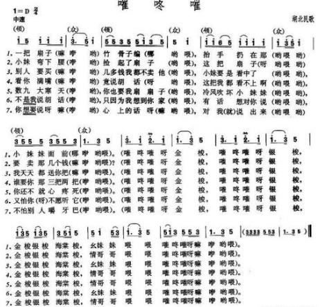 【映帆知識(shí)分享】嗺咚嗺(它是中國(guó)湖北省中南部的一種打梿枷號(hào)子,該歌曲作品有二個(gè)部分)嗺咚嗺 嗺咚嗺,它是中國(guó)湖北省中南部的一種打梿枷號(hào)子。因?yàn)樵谝r詞當(dāng)中有非常多的“嗺咚嗺”,所以呢,就有了這樣一個(gè)名字,而且呢,它又是被稱為叫做“打嗺咚”。在打場(chǎng)的時(shí)候,二排的人要面對(duì)面地站著打梿枷,是這樣:這排上、那排下,噼里啪啦地,一領(lǐng)眾和地唱著《嗺咚嗺》,這樣的歌聲和勞動(dòng)融合在了一起,并且讓人們慢慢地忘卻了疲憊。整這樣一首歌曲是被分為有二個(gè)部分。在歌曲的前半部分呢,它是由一個(gè)人來進(jìn)行領(lǐng)唱的,其他的人用襯唱和唱;但是呢,在而后半部分的地方,都是全部由大家一起來和唱襯詞的。