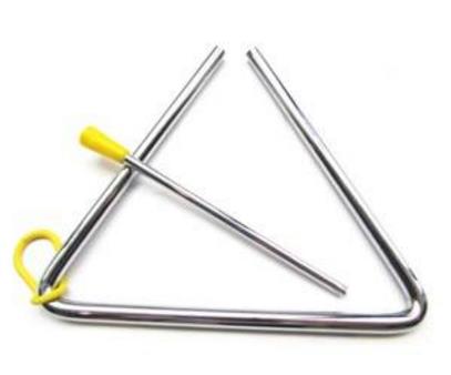 三角鐵,擊樂器。彎成三角形的細鋼條,用手提或懸掛,用小金屬棍擊奏發(fā)聲,無固定音高、音色清脆、優(yōu)美。可單奏、滾奏、震音,很有光彩。用于管弦樂隊中。